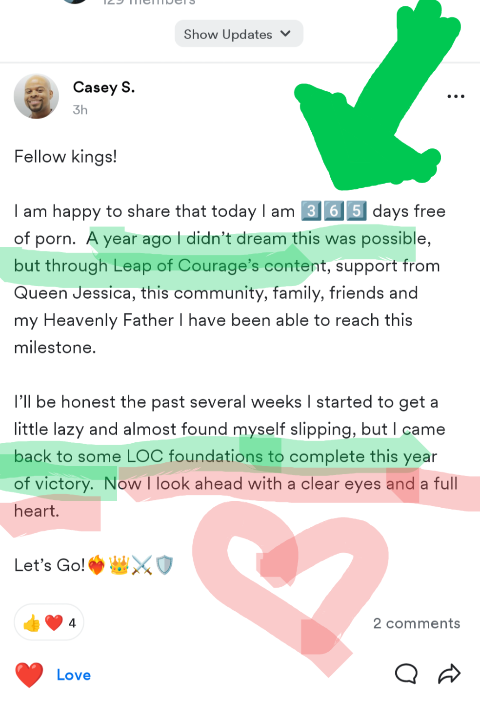 ā One of the MAJOR reasons why men watch porn:Ā porn requires no courage. Porn never rejects you. Porn asks nothing from you in return. Porn is like a kid in a candy shop with an unlimited shopping spree.... every day.Ā We are DEEPLY wired to be sexual beings. It's written in out DNA.Ā Most kids are exposed at age 10-11 and have no "guard rails". The PREFRONTAL CORTEX of the brain takes 25 years to develop, which means that men younger than that have lowered impulse control. Leap of Courage teaches how to strengthen the prefrontal cortex oof the brain, at ANY age!Ā Ā
